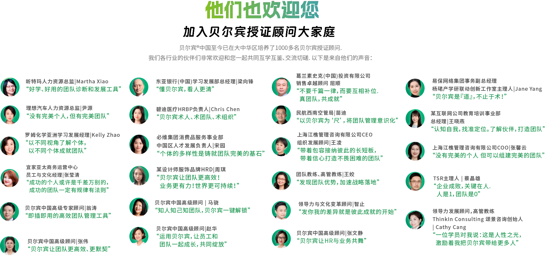 推荐给任何使用或希望使用贝尔宾团队角色这一黄金标准团队工具和理论的有志之士,以帮助团队发挥潜能。无论您是企业内部的业务管理者、HR、L&D 或培训方面的专业人士,还是独立的Facilitator或教练,通过贝尔宾认证都将为您提供坚实的贝尔宾理论基础,让您在报告解读和实施工作坊时能够信心十足。帮助个人提升自我认知、帮助团队优化协作、帮助业务做好业务。