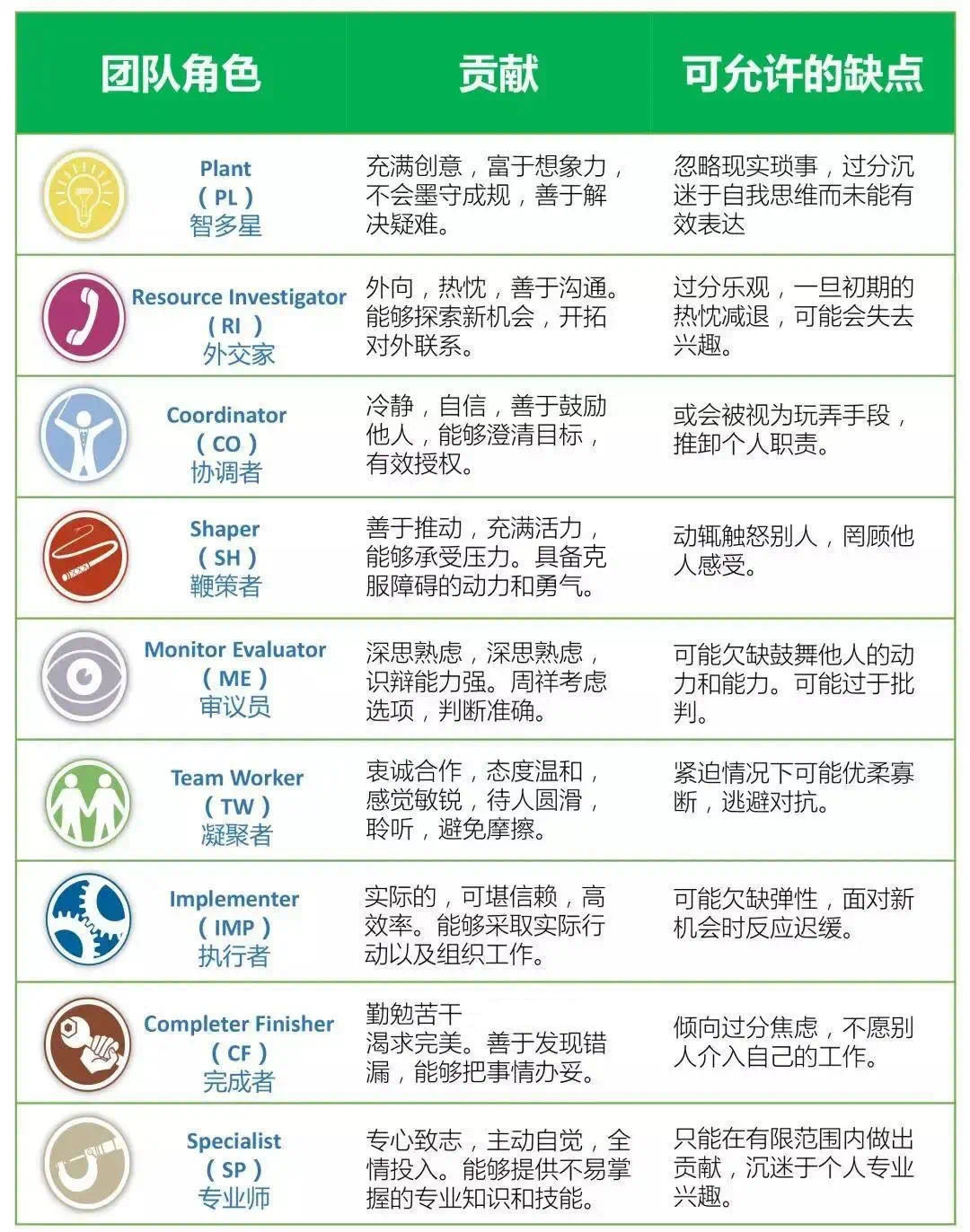 一支结构合理的团队应该拥有九个团队角色,即:鞭策者、执行者、完成者、外交家、协调者、凝聚者、智多星、审议员和专业师,这九个团队角色在团队中起着互补但同样重要的作用。