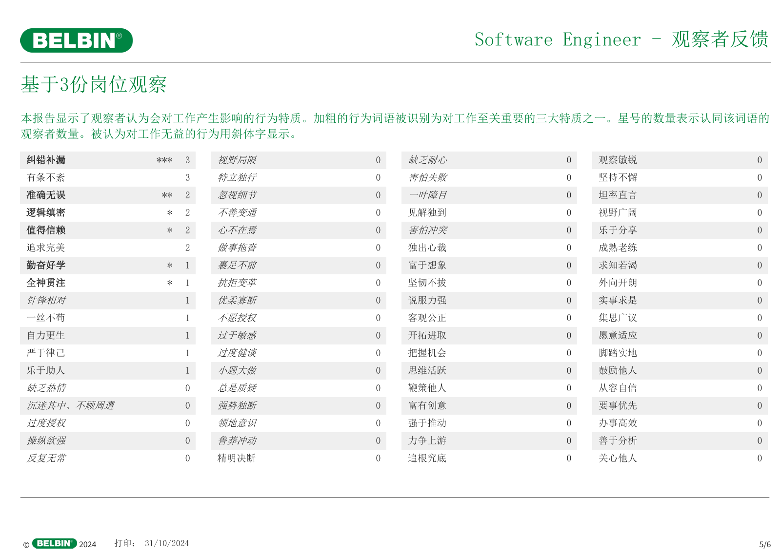 关于岗位的观察者词语清单:列出同事、客户和其他利益相关者认为工作岗位中重要的行为特征。可与个人报告中的“观察者词语清单 ”进行比较。