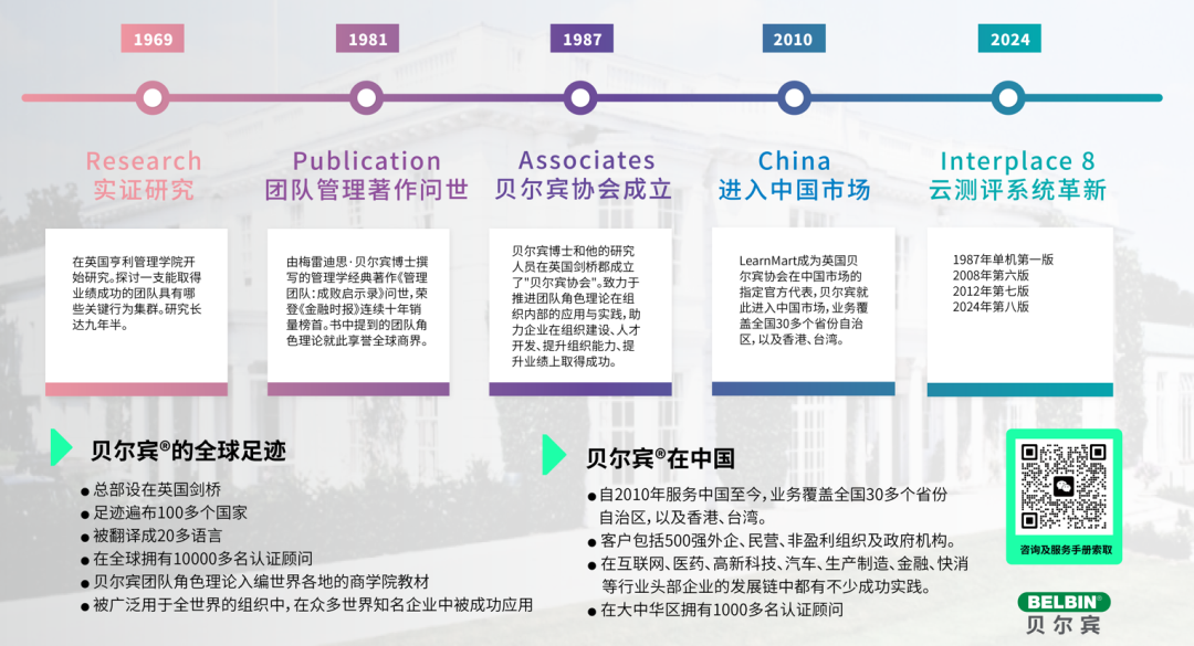 作为源自英国剑桥的团队协作领域先行者,贝尔宾自 1969 年起专注团队合作与绩效提升,业务足迹遍布 100 多个国家,理论体系被翻译成 20 多门语言并纳入商学院教材。